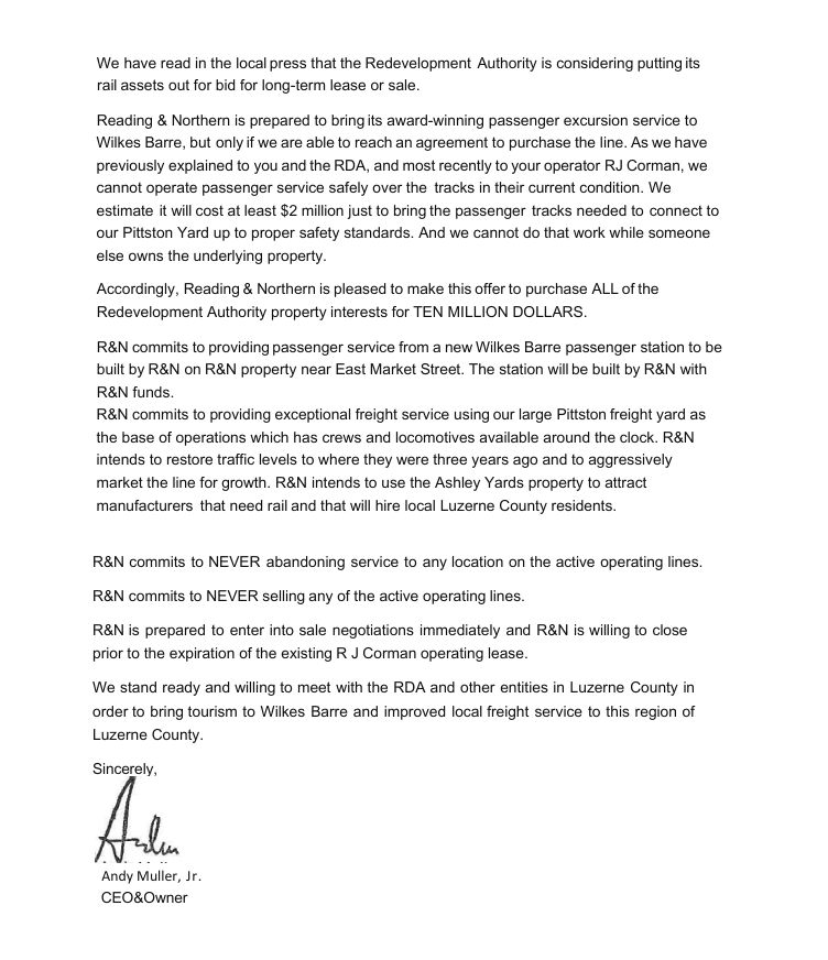 Reading & Northern Railroad Offers $10,000,000 to buy Luzerne County Rail lines