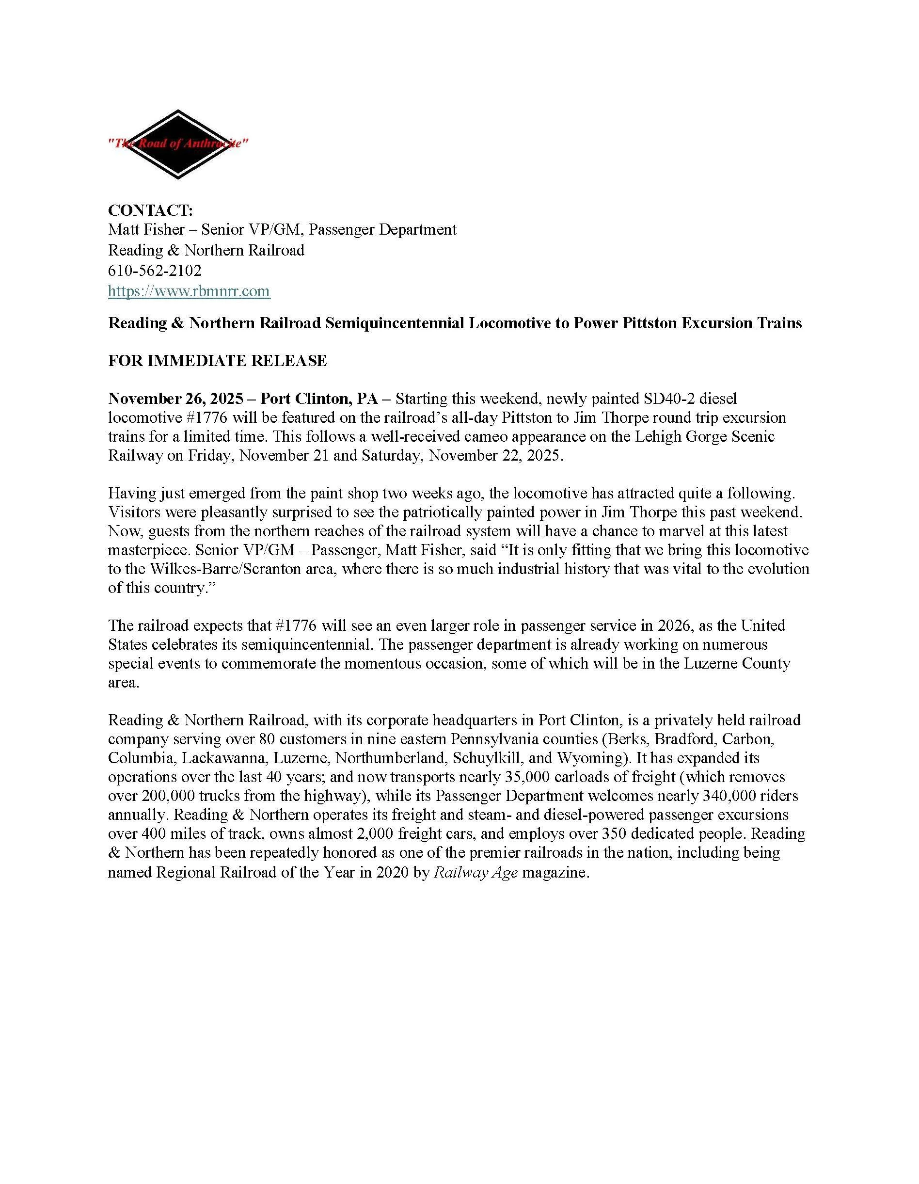 Reading & Northern Railroad Semiquincentennial Locomotive to Power Pittston Excursion Trains November 26, 2025