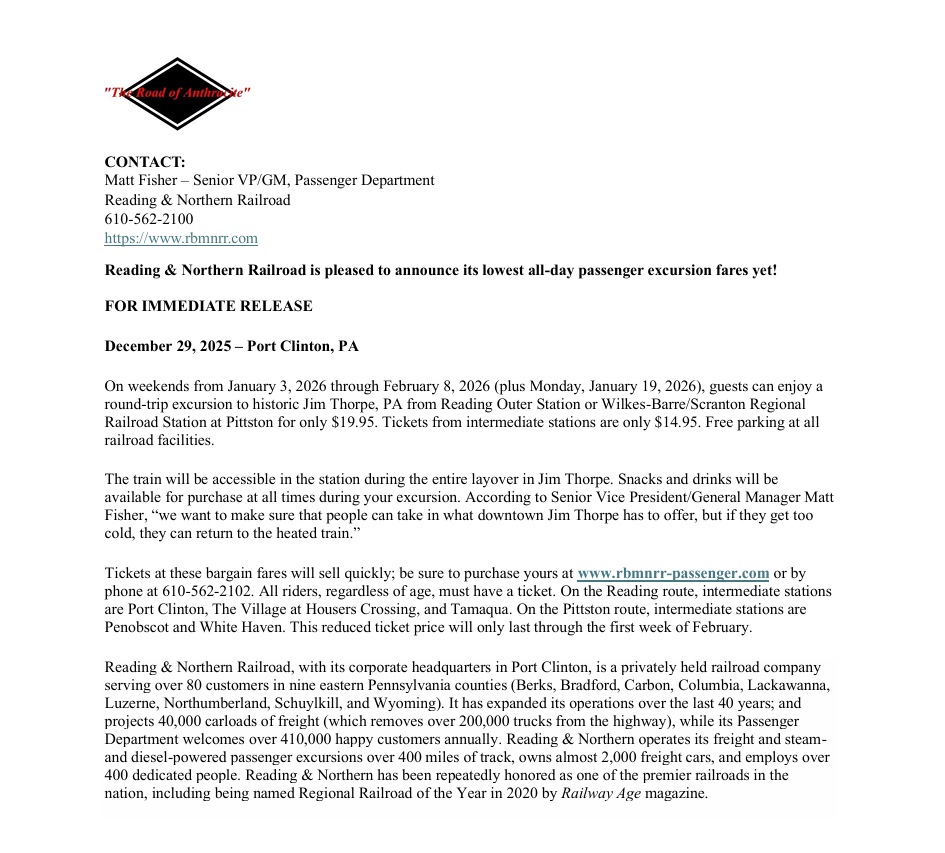 Reading & Northern Railroad is pleased to announce its lowest all-day passenger excursion fares yet!