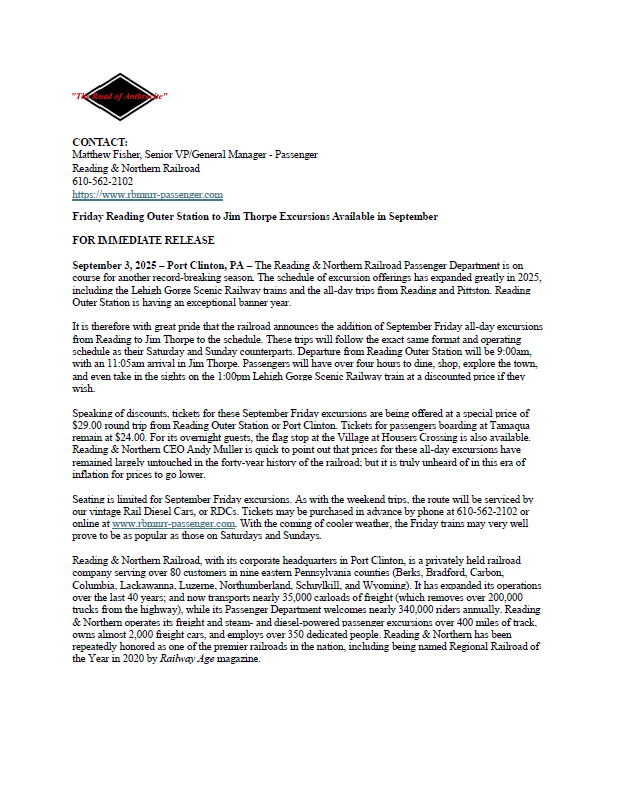 Friday Reading Outer Station to Jim Thorpe Excursions Available in September