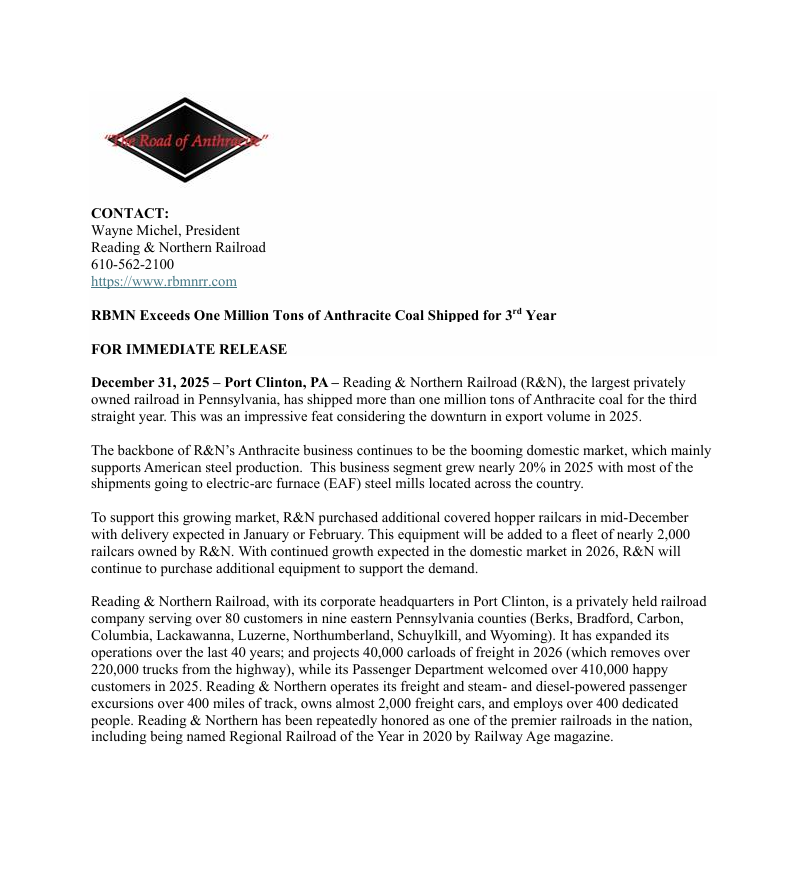 RBMN Exceeds One Million Tons of Anthracite Coal Shipped for 3rd Year December 31, 2025 ← Reading & Northern Breaks Freight and Passenger Records Again!Reading & Northern Railroad is pleased to announce its lowest all-day passenger excursion fares yet! →